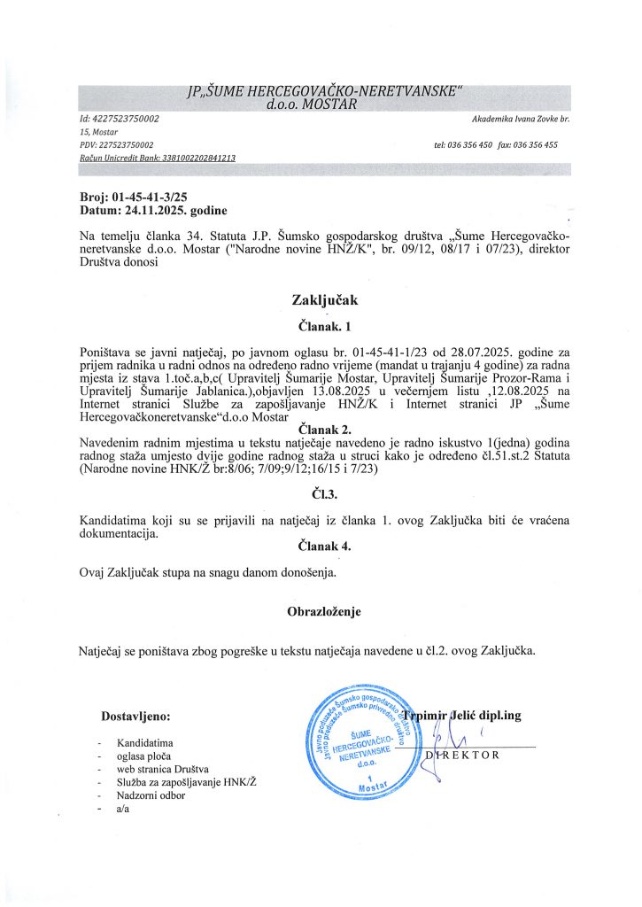 Poništenje javnog natječaja za prijem radnika